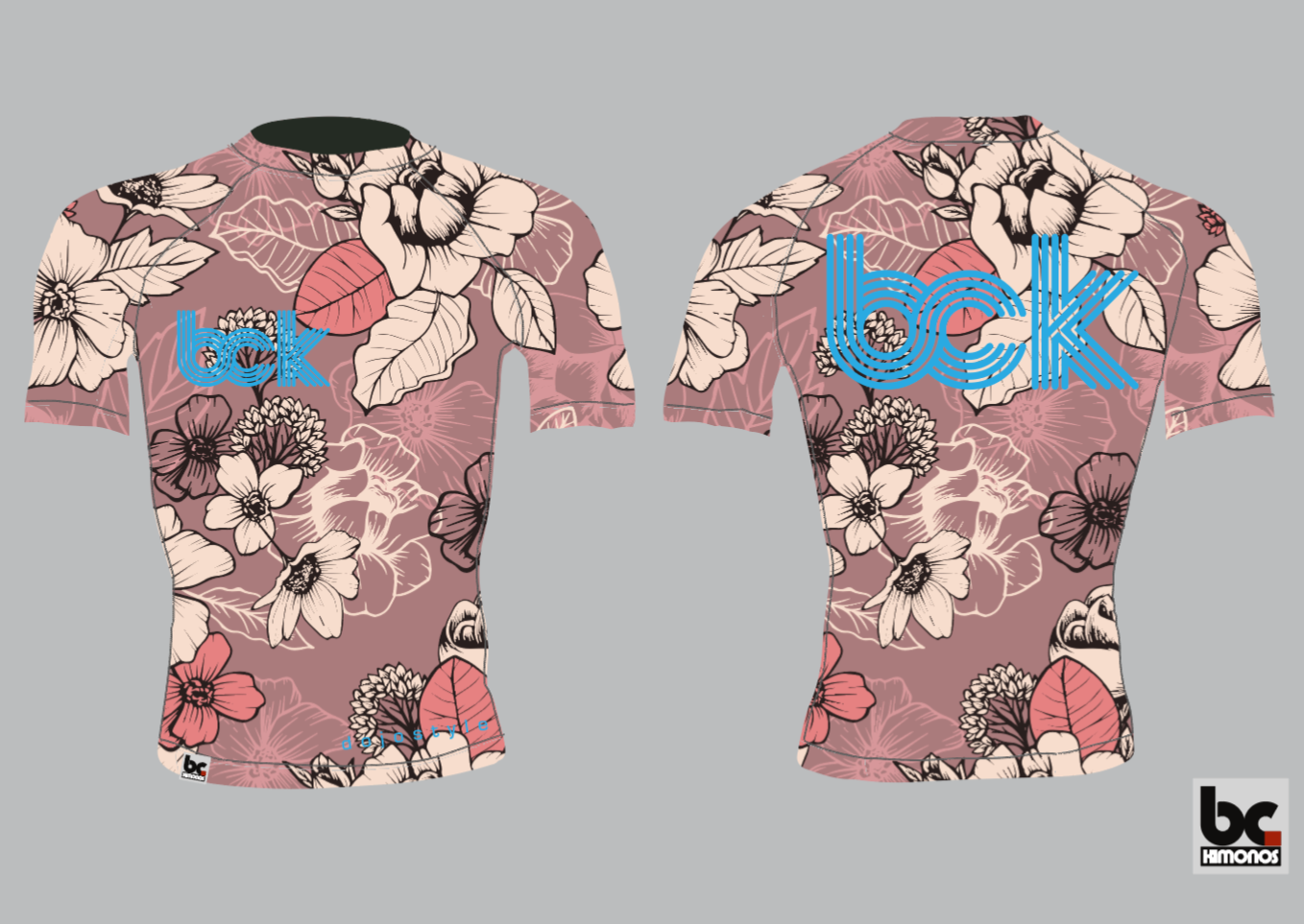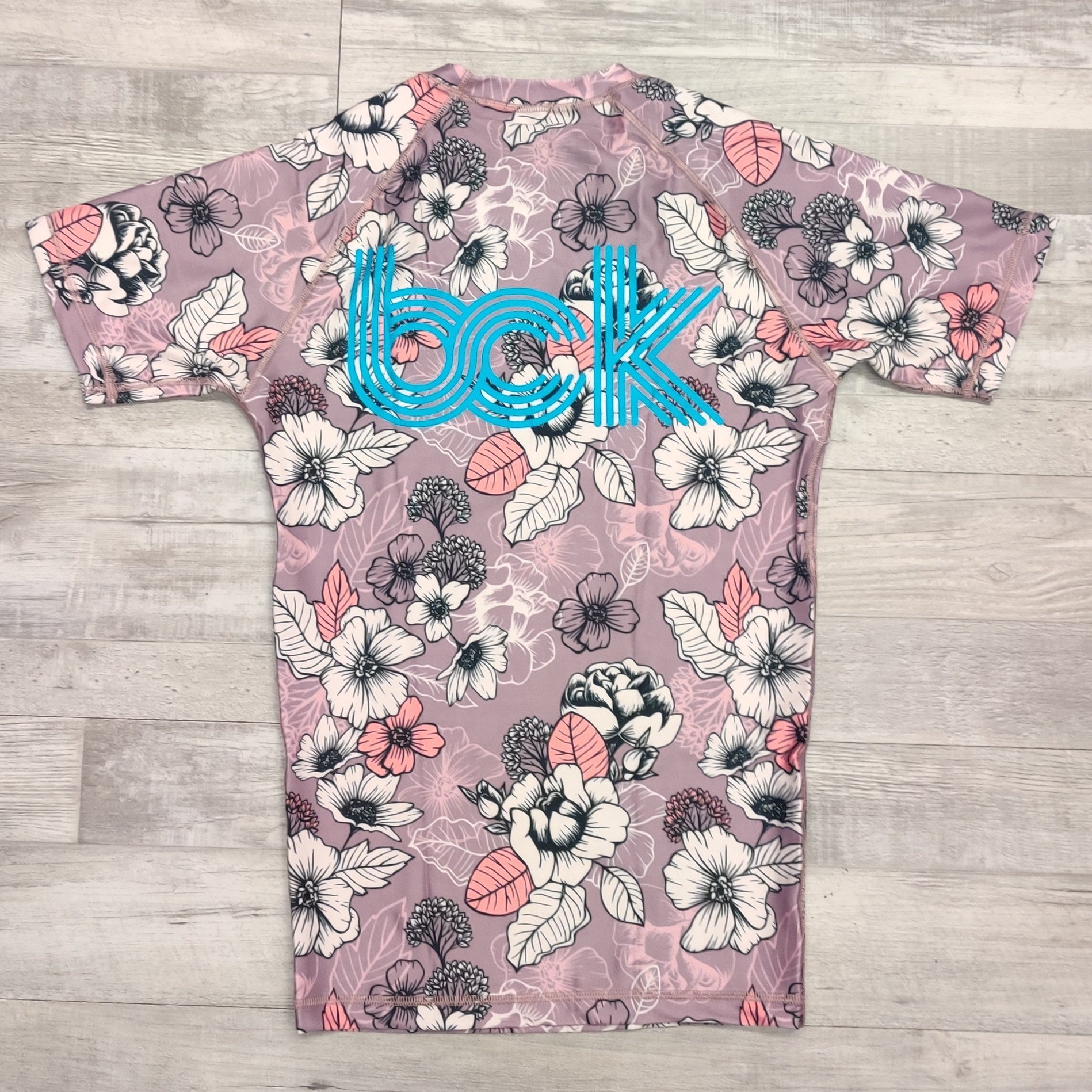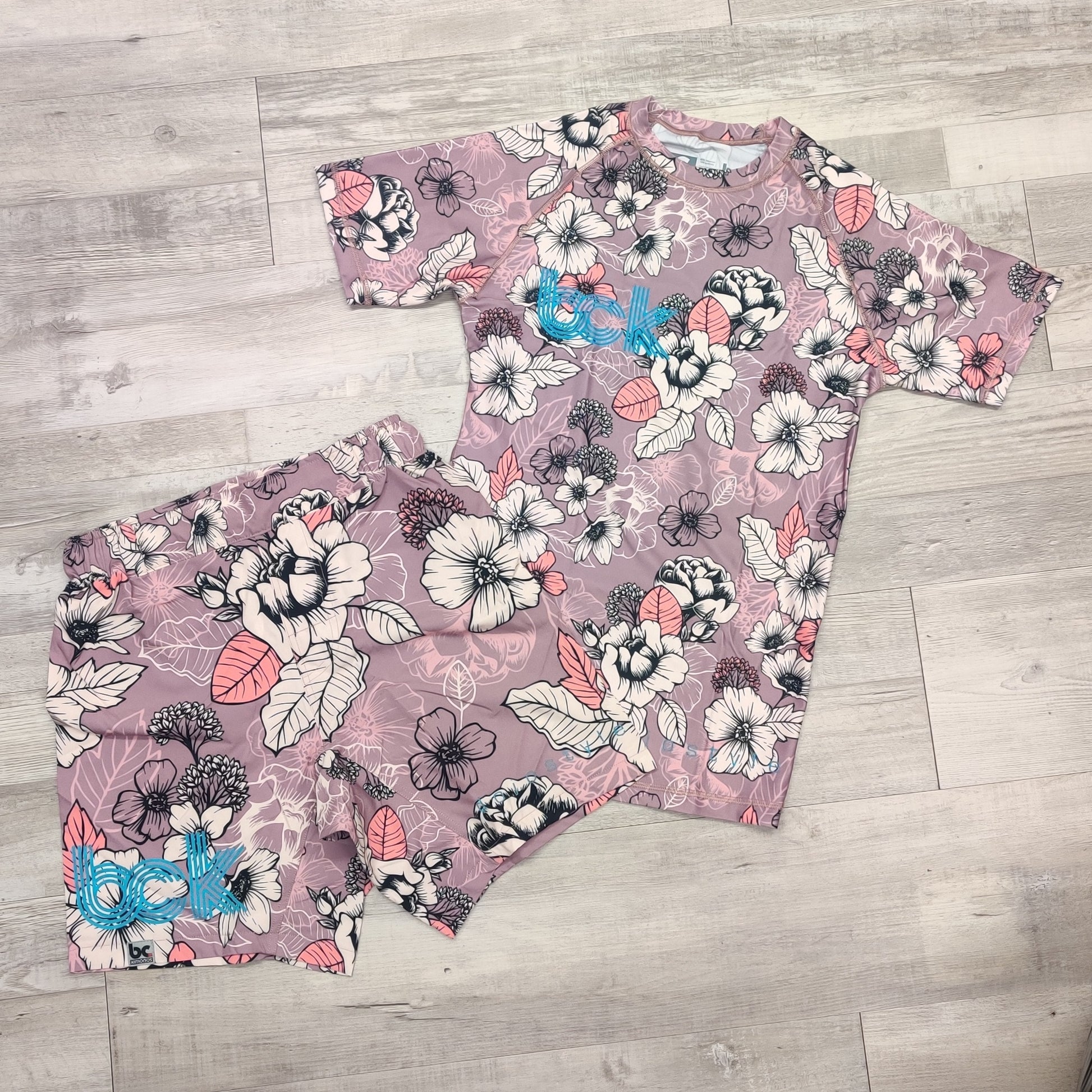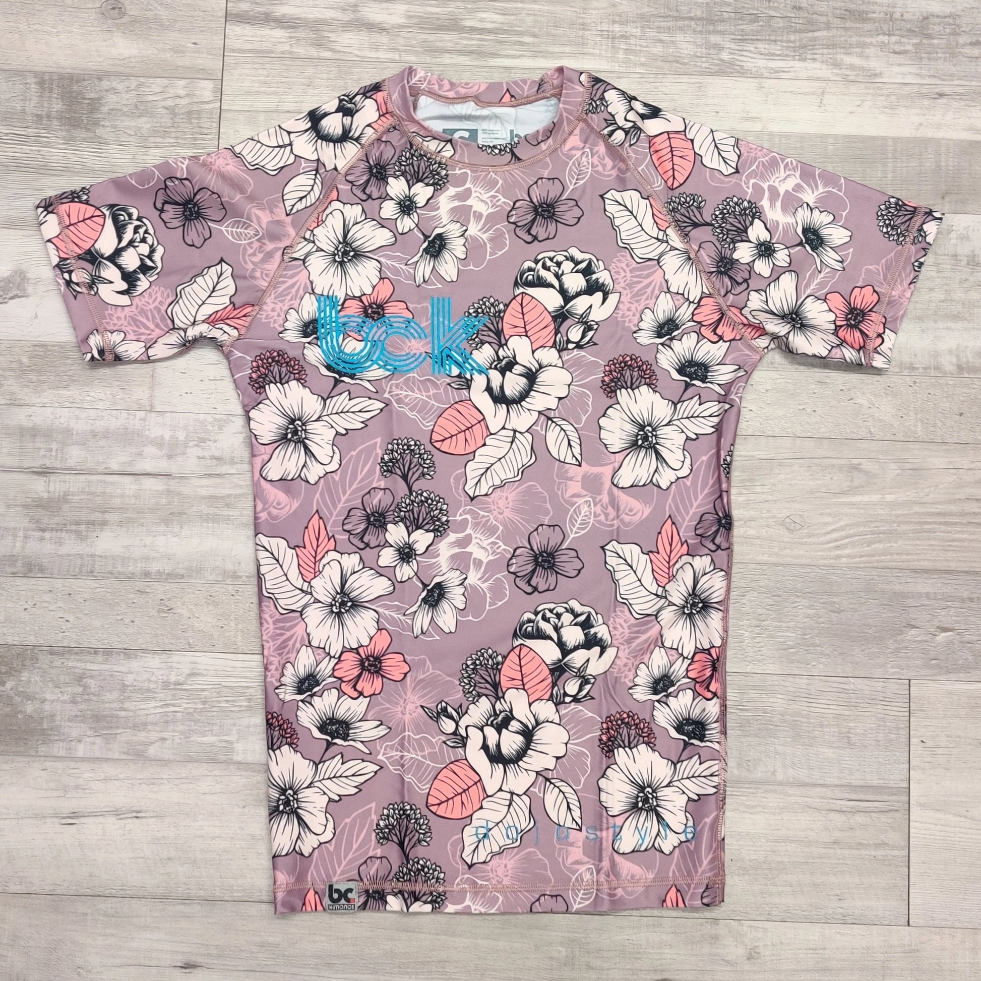 This limited edition rash guard features a dusty rose peony pattern with blue logos. Check out our matching Grappling shorts for the matching set.